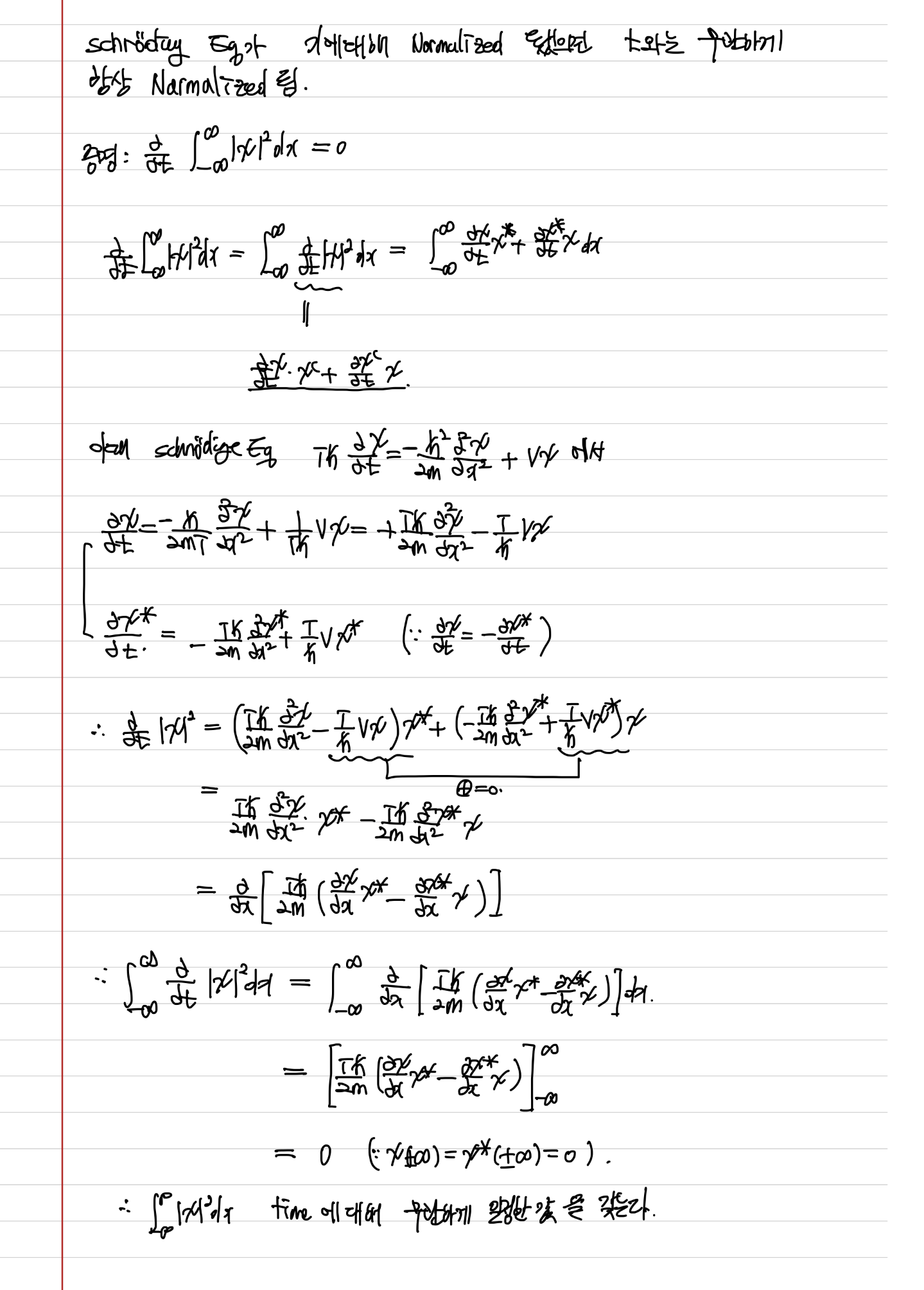 \[\frac{\partial \int_{-\infty}^{+\infty}\left|\Psi\right|^2 dx}{\partial t} = 0\] 임을 증명할 수 있다.