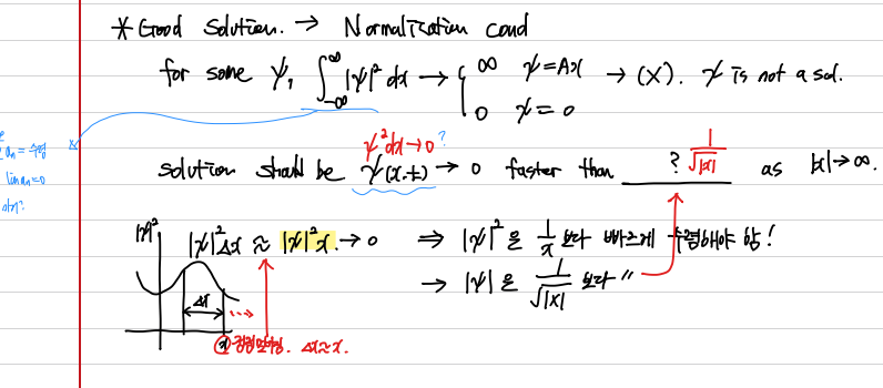 다시말해 \(\left|\Psi\right|^2 dx \to0\) 이고, x 가 무한대로 가면 \(dx \to x\) 이므로(교수님께서 이렇게 설명하셨는데, 오류가 있는 것 같다.), \(\Psi^2$ 이 $\frac{1}{x}\)보다 빠르게 수렴해야한다. \(\frac{1}{\sqrt{x}}\) 보다 0으로 더 빠르게 수렴해야한다.