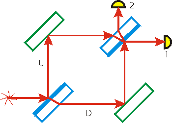 위 장치에서 Beam splitter에서 쪼개 진 빛이 각 mirror 1,2에서 반사된 뒤 다 시 beam splitter로 들어와 두개의 검출기 D0와 D1에 도달한다. 이때 두개의 path length를 미세하게 조정하여 한쪽에서는 보강간섭을, 한쪽에서는 상쇄간섭을 일어나게 할 수있다.