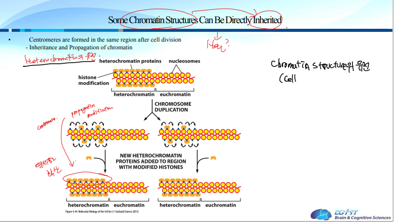 이런 chromatin structure가 유전(cell 단위)되는 경우가 있는데, 이는 어떻게 일어날까? heterochromatin은 어떻게 유전되는가? 하나의 DNA가 두개로 분리 되면 순간적으로 heterochromatin의 비율이 전 대비 1/2이 된다. 이때 hetero chromatin propagation이 일어나면서 다시 hetero chromatin 구조를 띄게 된다.