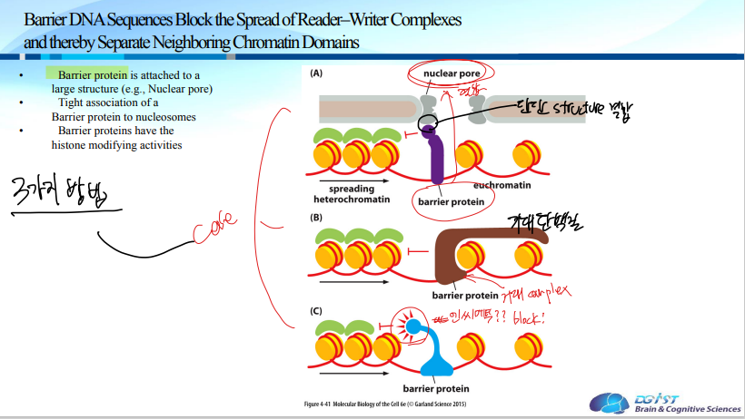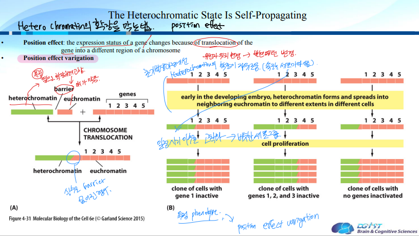 Hetero-chromatin은 그 특성상 Propagation이 잘 일어난다. 주변 염색질까지 헤테로크로마틴으로 만든다는 이야기다. 그래서 이를 막기위해 barrier라는 것이 존재하는데, Eu-chromatin을 보호해준다. 초기 발생단계에서는 이 배리어가 작용하지 않아서, heterochromatin이 주변으로 자유롭게 확장하는데, 이러다 어느순간 barrier가 작용하여 확장을 멈춘다. 그때부터는 그 동일한 상태로 세포분열이 죽 일어나게 된다. 이 헤테로 크로마틴의 확장 정도와 범위에 따라 어떤 유전자가 발현될지가 결정된다. 이는 세포 phenotype의 다양성에 기여한다. 이 현상을 position effect varigation이라 부른다.