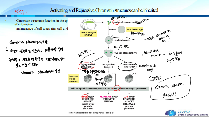 그런데 이 chromatin structure가 무슨 역할을 하는가? 세포가 발현하는 유전자의 pattern을 결정한다. 예를 들어 간세포가 세포분열을 했는데 뇌세포 두개가 된다면 어떨까? 좋지 못한 일이다. 그래서 간세포가 분열할때 같은 간세포 두개가 되기 위해선 이 chromatin structure의 inheretence가 중요하다. 이는 myoD 실험을 통해서 알아볼 수 있다. myoD 유전자를 발현하는 세포의 핵을 추출하여 핵이 제거된 egg에 넣은 뒤 분열 시킨다. chromatin structure 가 유전되기 때문에 계속 myoD가 발현될 것이다. 그 분열된 딸세포를 세개 그룹으로 나눈뒤, 한 그룹에는 H3.3 히스톤을 주입하고, 하나는 그대로 두고 나머지 하나에는 H3.3 mutant를 주입한다. H3.3는 MyoD 유전자를 발현하는데 반드시 필요한 단백질이다. 세번째 그룹은 아무리 chromatin structure 가 유지되더라도 functional 한 H3.3를 mutant가 대체하므로 myoD 발현이 일어나지 않는다.