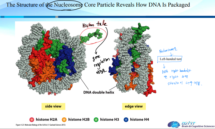 nucleosome 의 구성. histone은 4종류의 histone이 각각2개씩 모여 총 8개의 히스톤 단백질이 하나의 nucleosome 을 구상한다. 이 히스톤 8면체를 DNA가 1.7바퀴 정도 Left handed 방향으로 감는다. DNA가 right handed라서 같은 방향으로 감을 경우 DNA에 너무 큰 stress가 가기 때문이다. Histone은 postive charged이고, DNA의 backbone이 Negative charged되어 있다. Histone Tail 이라는 것이 존재하는데 이는 후에 Gene regulation에 매우 중요한 역할을 함이 밝혀졌다.