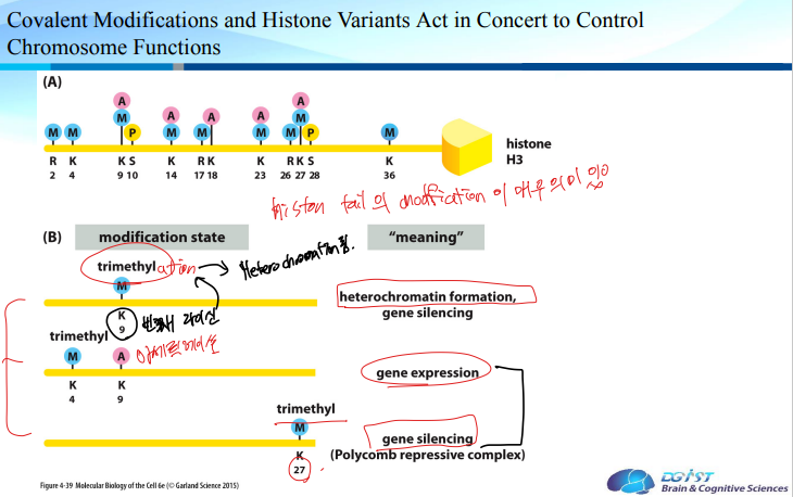 히스톤 tail의 modification은 다양하게 이루어진다. Acetylation, Methylation, Phosphorlyation이 일어난다. 이 현상들은 가역적인 화학변환이다. 이 변환을 일으키는 효소와, 되돌려 놓는 단백질이 둘 다 존재한다. 예를 들어 histone H3의 9번 아미노산의 methylation은 heterochromatin formation을 일으킨다. 또 동일 부위가 acetylation되고 4번이 methylation 되면 gene expression이 일어나고, 27번이 methylation 되면 gene silencing이 일어난다.
