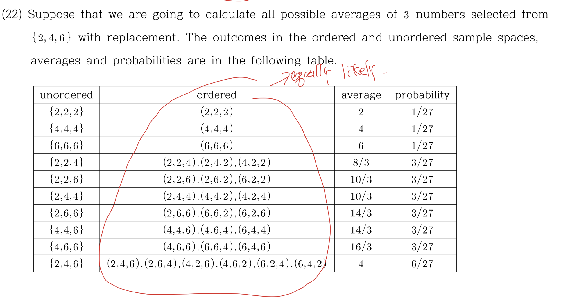 2,4,6 중에 with replacement로 세번 샘플링 한다 치자. 우리가 (2,4,4)라는 이벤트의 확률과 (2,4,6)라는 이벤트의 확률은 같지 않다. 즉 sample space의 각 event 들의 확률이 다르므로 equally likely 하지 않다. 이럴 경우에 이 친구들의 확률 계산을 sample space에서 하면 틀리게 된다. 각 event의 확률을 각각 계산해야한다.