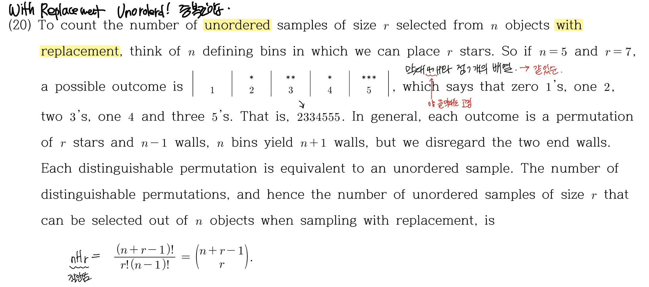 \(x + y + z = 10 \) x,y,z는 정수 ... 이런 문제에서 자주 본 중복조합. 보통 막대기와 공의 배열로 설명을 한다. 우리가 총 n개의 구별되는 구슬이 있고, 중복을 허용해 r번 뽑은 뒤 각각의 공이 총 몇번 뽑혔는지 기록한다고 하자. 이 기록의 경우의 수는 다시 r이라는 수를 n등분 (0개도 하나의 등분으로 포함) 하는 경우의 수다. 막대 n-1개와 공r개를 나열하는 경우의 수와 같다. r개와 n-1개가 각각 구분이 되지 않는 distinguish permutation 이므로, 이 경우의 수는 \(\binom{n+r-1}{} = \frac{(n+r-1)!}{(n!)(r-1)!}\)이다. 참고로 nHr 이라는 식은 해외에서는 잘 쓰이지 않고 한국과 일본에서만 쓰인다고 한다.