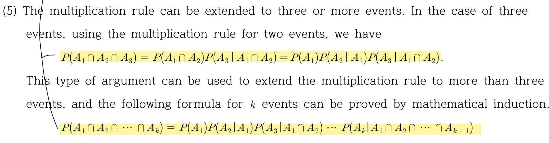2개에 대해서 되면 N개에 대해서도 항상 된다! (김주한 교수 曰) 수식 길어서 사진으로 대체. 순서에 집중해서 외우기. A1,A2,A3에 대해서는, \(P(A_1) P(A_2|A_1)P(A_3|A_1 \cap A_2)\)