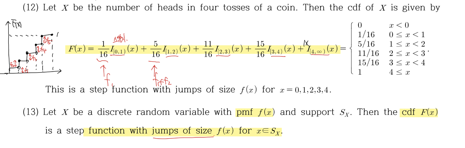 구간별로 누적되는 함수이므로, pmf가 점차 쌓여가는 함수이다. Step function with jumps of size f(x) for \(x \in S(x)\)