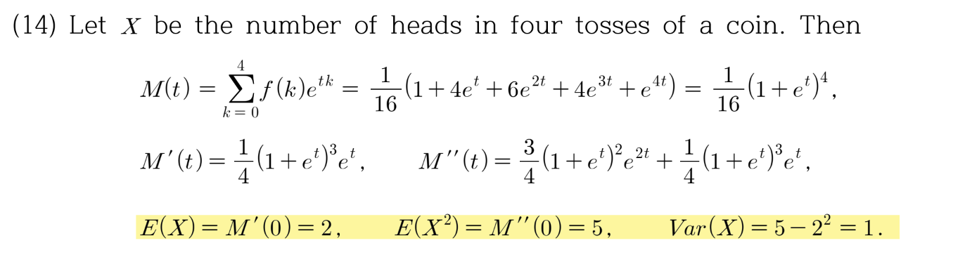 위에 예시에서, 확률변수 X는 동전을 4번 던졌을때 나오는 앞면의 횟수이므로, f(k)는 앞면이 k 번 나올때의 확률을 의미한다. M(t)를 구해주면 \(e^{tX}\) 의 평균을 구해주면 되는 것이고, 그렇게 얻은 mgf는 우리가 E(X)가 필요할때는 한번 미분해서 t=0 넣고, Var(X)가 필요할 때는 두번미분해서 얻은 모멘트와 평균의 제곱을 빼서 구한다.