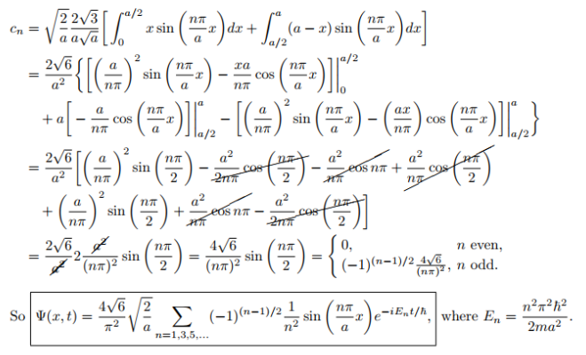 \[\Psi(x,0)= \sum c_n \sqrt{\frac{2}{a}}\ sin(\frac{n\pi}{a}x)\]