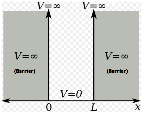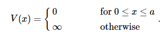 무한 퍼텐셜 우물이라고도 불리는 이 상황은, 다른 말로는 Particle in a box 라고도 불린다. 길이가 L인 구간의 퍼텐셜은 0이고, 양쪽의 무한대 퍼텐셜 벽에 가로막혀있다. 이 경우에 퍼텐셜 식은 다음과 같다.