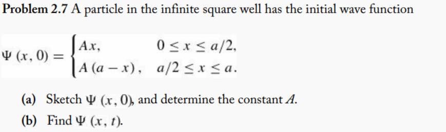 그리피스 책의 문제 하나를 가져왔다. 이 초기조건으로 \( c_n\) 을 구해보도록 하자. 우리는 Orthogonal condition이라는 방법을 사용하여 \( c_n\)을 구해줄 것이다. (참고로 위 문제의 A값은 Normalization 하면 \( A = \frac{2\sqrt{3}}{\sqrt{a^3}} \) 이다.