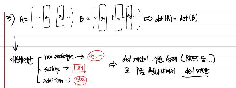 이로써, 세가지 기본행연산 과정에서 det 의 양상이 크게 변하지 않음을 알게 되었다.