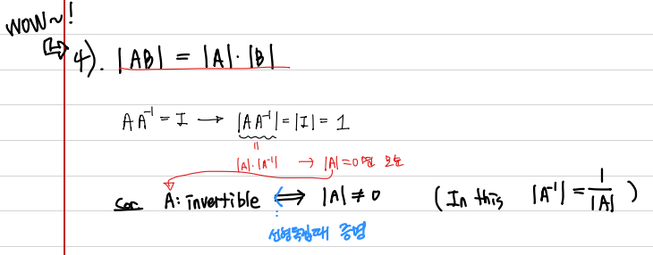 또한 A matrix가 Inversible 한지를 결정한다. Det가 0이 아닐때만 그 행렬은 Inversible하다고 말할 수 있다. (이는 후에 설명하겠다.)