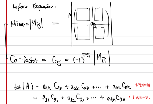 Minor와 Cofactor 를 이용하면, 행렬식을 아주 편하게 적을 수 있다. 하나의 행 또는 하나의 열에 대해 Laplace Expansion을 하면 행렬식을 구할 수 있고, 특히 0이 많은 행/열을 골라 그것에 대해 전개하면 훨씬 쉽게 계산할 수 있다.
