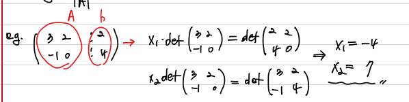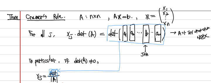 \( A' := \) j-th col is replaced with \(\vec(b)\) 여기서 det(A)가 0이 아니라면, 우리는 x_j를 구할 수 있다. 이는 다시말해 determinent가 0인 행렬은 역함수가 없다는 말과도 같다.