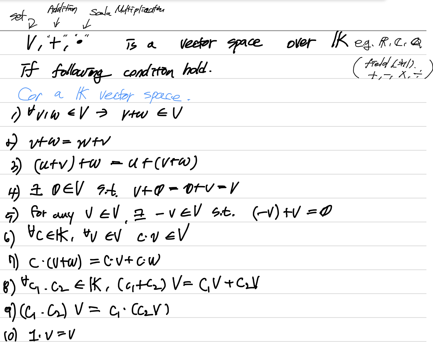 우리가 어떤 집합이 Vector Space인지를 판단하기 위해서는 3가지를 알아야한다. (1)Set (2)Addition (3)Scala Multiplication 이 세가지가 그 공간에서 어떻게 정의되는지를 알아야한다. 이게 무슨 생뚱맞은 소리인가 반문할 수도 있다. 덧셈이 그냥 덧셈이지, 상수곱이 그냥 상수곱이지 어떻게 정의되느냐가 무슨 의미가 있냐고 물을 수 있다. 그러나 그건 우리가 관용적으로 자주 사용하던 벡터공간의 법칙에 너무 적응한 탓이고, 연산을 새롭게 정의해주면, 그건 다른 공간이 될 수 있다. 예를 들어, 우리가 벡터 (a,b)와 벡터 (c,d)를 더할때, 어떻게 더하는가는 우리가 정해주기 나름이다. \[ \left ( a,b \right ) + \left ( c,d \right ) = \left ( a+c, b+d \right )\] 가 성립함은 너무도 당연하지만, 사실 이건 우리가 이 벡터공간을 만들어주기위해 임의로 정한것이다. 덧셈을 다르게 정의하면 이 집합은 벡터공간이 되지 않을 수도 있다. 예를 들어 \[ \left ( a,b \right ) + \left ( c,d \right ) = \left ( a-c, b-d \right )\] 이렇게 정의해주면 후술될 여러 조건을 만족시키지 못한다. 상수곱도 마찬가지이다. 우리는 상수곱을 각 성분에 상수를 곱하는 것으로 정의했다.\[ k \left ( a,b \right ) = \left ( ka,kb \right ) \] 하지만 이 역시도 우리가 다르게 정의해줄 수 있는것이다. 그러나 그것이 벡터공간이 될지는 장담할 수 없다.
