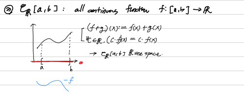 마지막으로 어떤 구간 [a,b] 정의된 모든 연속함수의 집합에 대해, 덧셈과 상수곱이 우리가 알던대로 정의된다면 벡터공간이다. 항등원은 y=0 상수함수이고, 역원은 x 축 대칭함수이다.