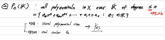 최고차항의 차수가 n보다 작거나 같고 모든 계수가 K 집합(실수, 허수, 복소수, 유리수 등등)의 원소인 Polynomial의 집합이 있다. 이 역시 덧셈과 상수곱이 관습적으로 정의된 것과 같다면 벡터공간이다. 그러나! 만약 최고차항의 차수가 n인 다항식의 집합이라면 벡터공간이 아니게 된다. 왜냐면 어떻게 잘 빼면 최고차항의 차수가 낮아지기 때문이다.