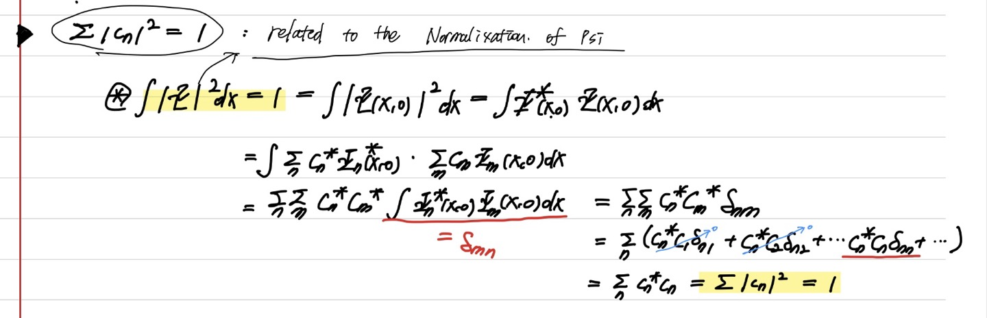 \( |c_{n}|^2\)은 Discrete한 각 state에 대응되는 확률이므로, Probability mass function이라 할 수 있다. 따라서 Normalization condition을 만족해야한다. \[ \sum |c_{n}|^2 = 1\]