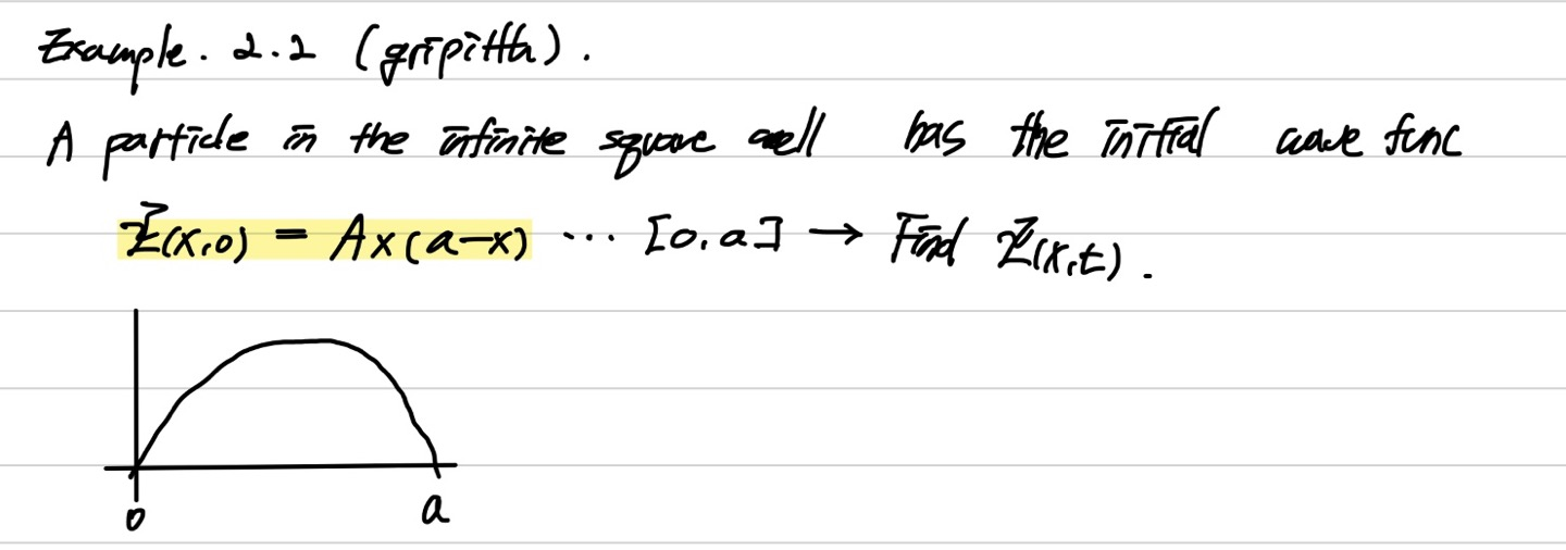 Initial condition을 받았다. infinite well 이므로 우리는 기본적으로 TISE solution 및 general solution의 포맷을 갖고있다.