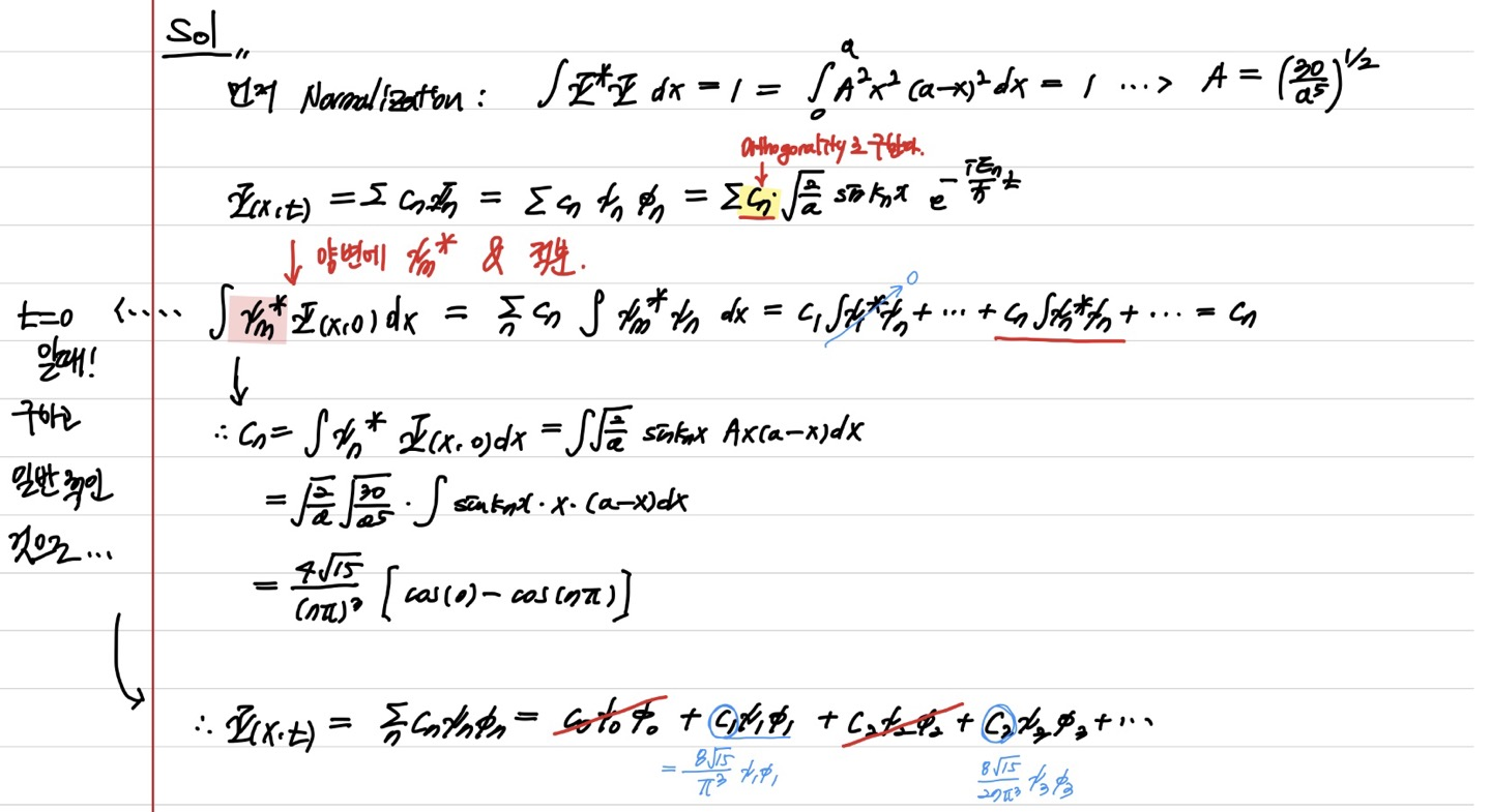 처음에는 A의 값을 찾아야 하므로 Normalize 해야한다. A의 값을 구했으면, 바로 계수를 찾아준다. 계수를 찾을때는 Orthogonality를 활용한다. 이때 general form 이 아니라 initial condition에 해줘야한다. 풀이는 아래와 같다.