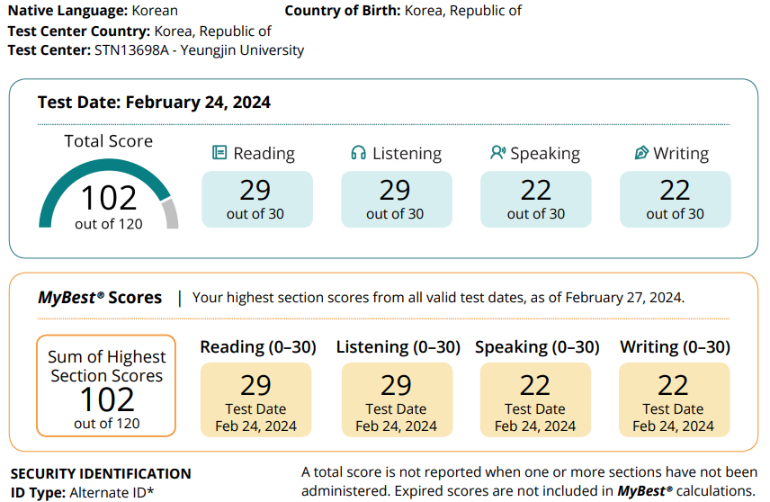 결과는 102점, 드디어 목표점수였던 100점을 달성했다. 영역별 점수 추이는 R/L/S/W 순으로 처음 볼때 23/20/19/21(83점) 두번째 29/25/21/21(96점) 그리고 마지막 29/29/22/22(102점) 이다. 첫 시험(2019년)과 두번째 시험(2023년) 사이의 간격은 4년인데, 그 기간 동안 영어 공부를 꾸준히 한 것은 아니다. 처음과 마지막을 비교하면 리딩과 리스닝이 많이 올랐고 (R:23->29 / L:20->29) 스피킹은 3점 올랐으며 (19->22) 라이팅은 거의 오르지 않았다(21->22).
