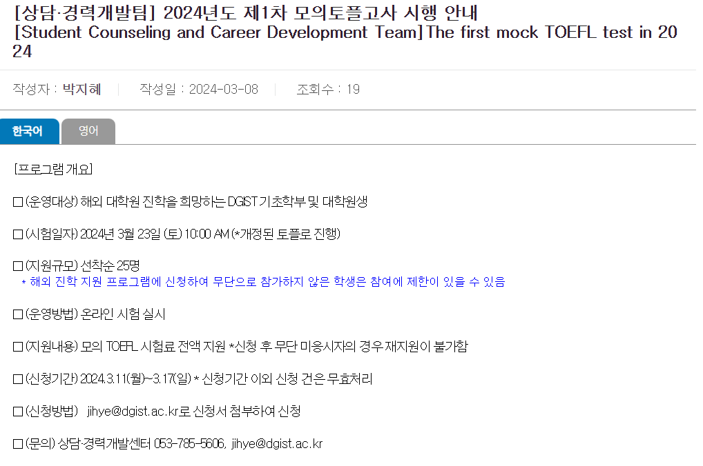 - 응시료지원: 점수에 따라 응시료 일부(15~20만원)을 지원해줌. 1년에 20명 선착순인데 23년 8월 기준 10자리 정도 남아있었음. my.dgist 포털 공지사항에 어학시험 응시료 지원 게시물 찾아볼 것. 문의처는 상담경력개발센터