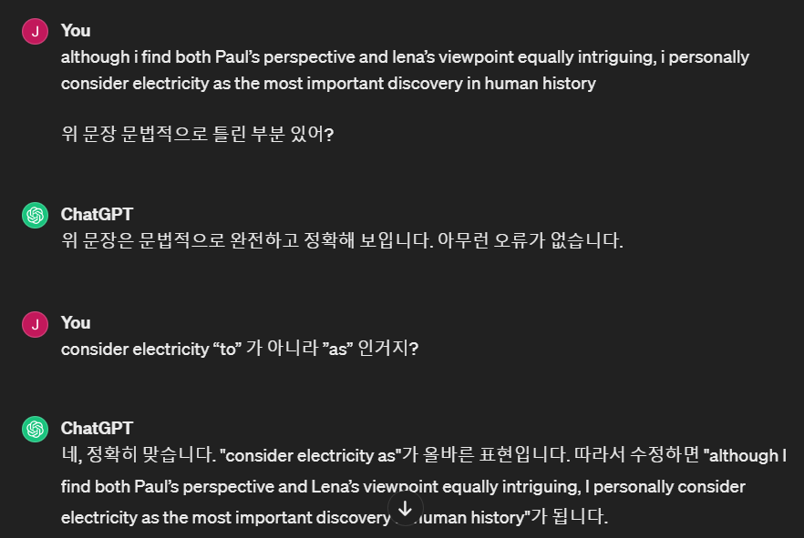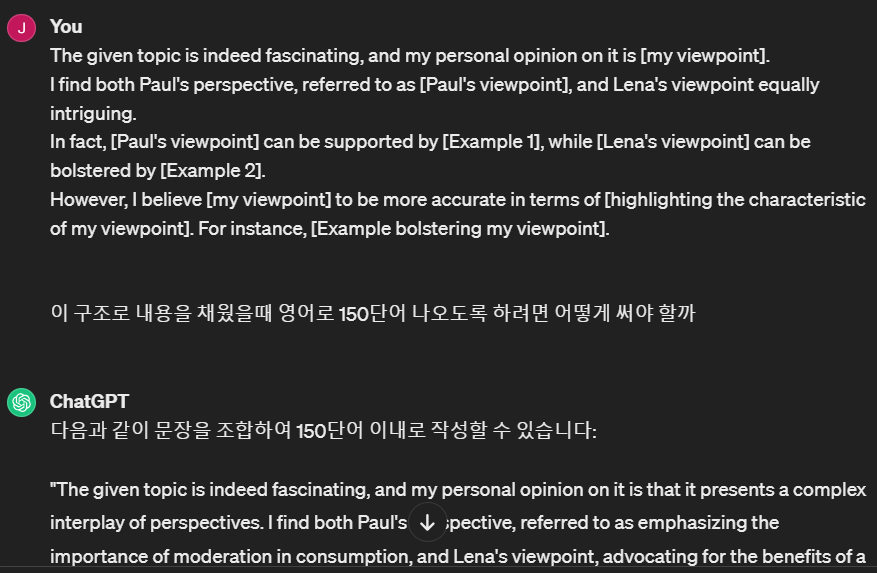 마지막으로 ChatGPT 를 사용한 라이팅 첨삭이다. 인공지능은 speaking 표현을 찾을 때도 쓸 수 있지만, writing 에서 적절한 표현을 찾는데도 잘 쓸 수 있다. 다양한 방식으로 AI를 쓸 수 있다. 가장 먼저 내가 쓴 essay를 통으로 올려놓고 문법, 문장의 자연스러움, 내용흐름을 검토해달라고 요청할 수 있다. 두 번째로는 내가 하고 싶은 말을 official 하고 academic한 영어로 써달라고 요청할 수 있다. papago같은 번역 프로그램보다 챗지피티가 좋은 지점이 바로 문체를 선택해서 번역할 수 있다는 것이다. 세번째로는 아예 template 구조를 넣고 그 구조대로 예시 essay를 써달라고 할 수도 있다.
