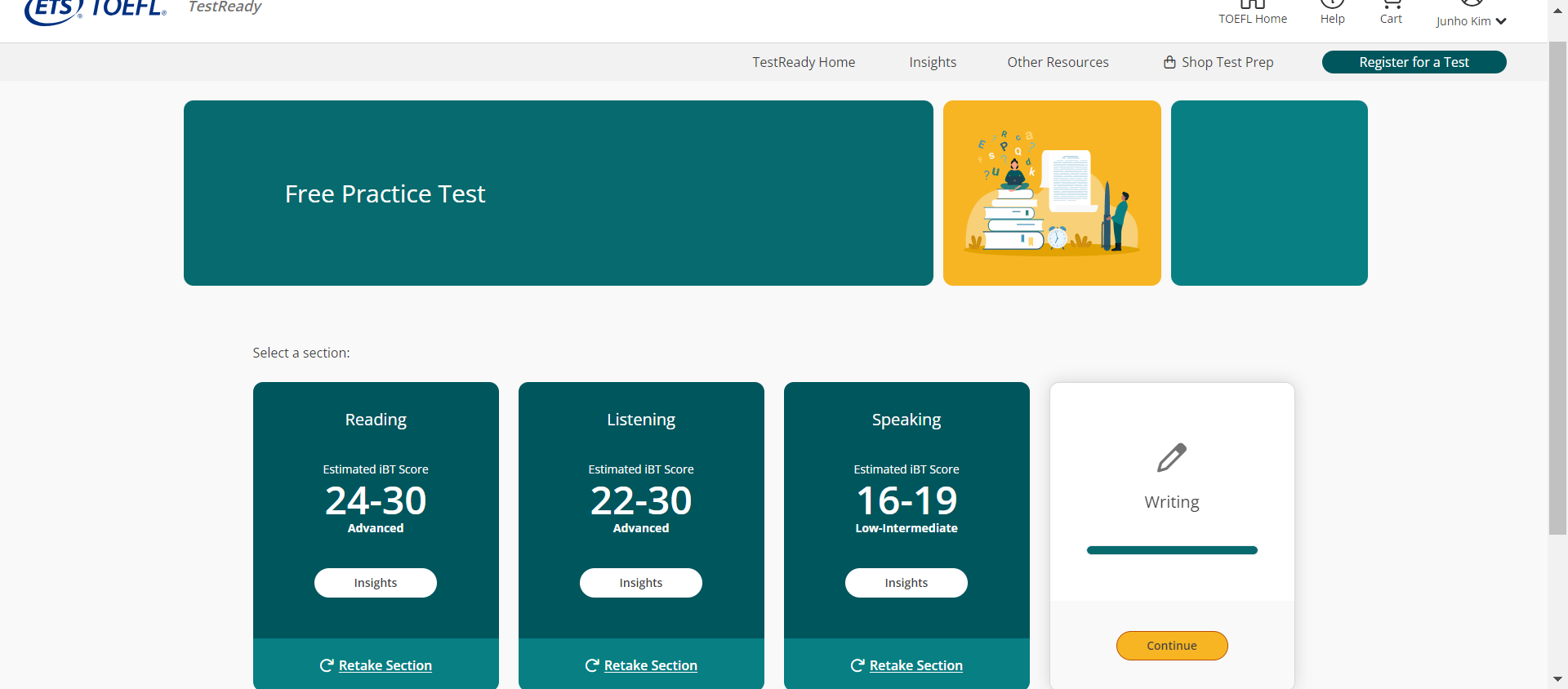 공짜로 토플 모의고사를 한 세트(리딩 리스닝 뿐만 아니라 스피킹 라이팅까지) 공짜로 풀 수 있고, 인공지능이 채점도 해준다. 한 번 치고 나면 인공지능이 내 예상 점수를 알려주고 어떤 부분이 부족한지 알려준다. retake session을 누르면 다시 시험을 칠 수 있다. 단 이때 문제는 바뀌지 않고 그대로이다.
