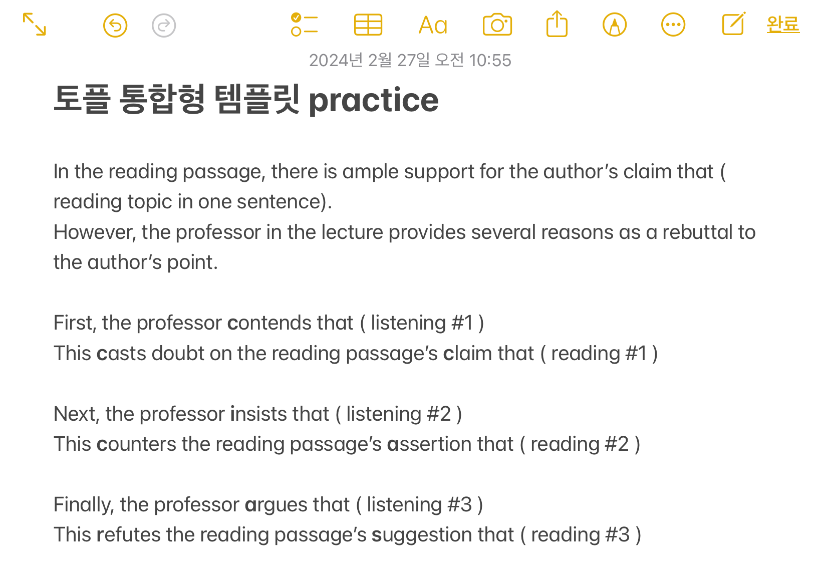 통합형 글쓰기는 다음과 같이 연습했다. (1) template 암기(2) 문제 풀어보기 (Hackers writing 정규 4th) (3) 내 답안 문법 오류, 어색한 문장 AI 검수 . 아래의 template을 암기한다. 아래는 내가 실제로 암기하고 실전에서도 사용한 템플릿이다.