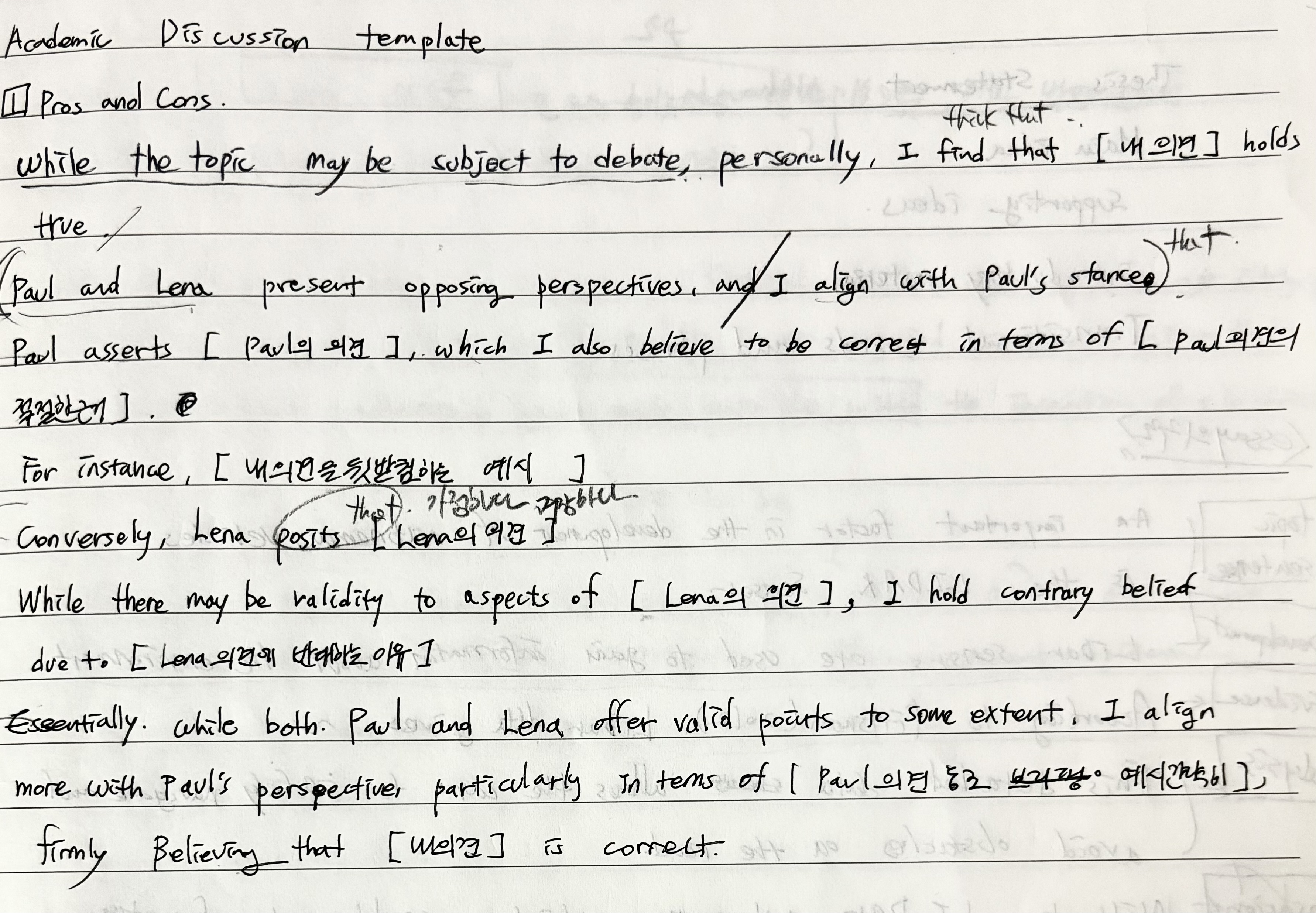 23년 7월에 토플이 개정되면서 새로 나온 유형의 문제다. 그래서 아직 template이 온라인에서 마땅히 구하기가 어렵다. 23년에 인강을 들을 때 까지만 해도 아예 이 유형을 다뤄주지도 않았다. Academic discussion은 링크 걸어 놓은 블로그에 많은 예시 문제들과 예시답안이 있다. 나의 템플릿은 아래와 같다.