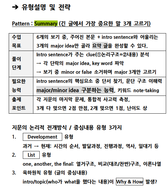 먼저 문항 유형별 연습이다. 이건 인강의 도움을 꽤 많이 받았다. 특히 summary 유형을 원래 잘 못했는데, 인강 선생님의 팁에 따라서 공부를 했더니 거의 틀리지 않게 됐다. 리딩 점수가 부족하다면 인강 듣고 연습하는 걸 추천한다. 아래 사진과 같이 어떤 문제를 어떻게 풀어야 하느냐를 인강에서 분석해준다. 난 해커스 이혜진 강사를 들었는데 다시 말하지만 어떤 인강을 듣느냐는 큰 차이 없다고 생각한다. 아래는 인강 강사가 나눠준 유인물의 일부이다.