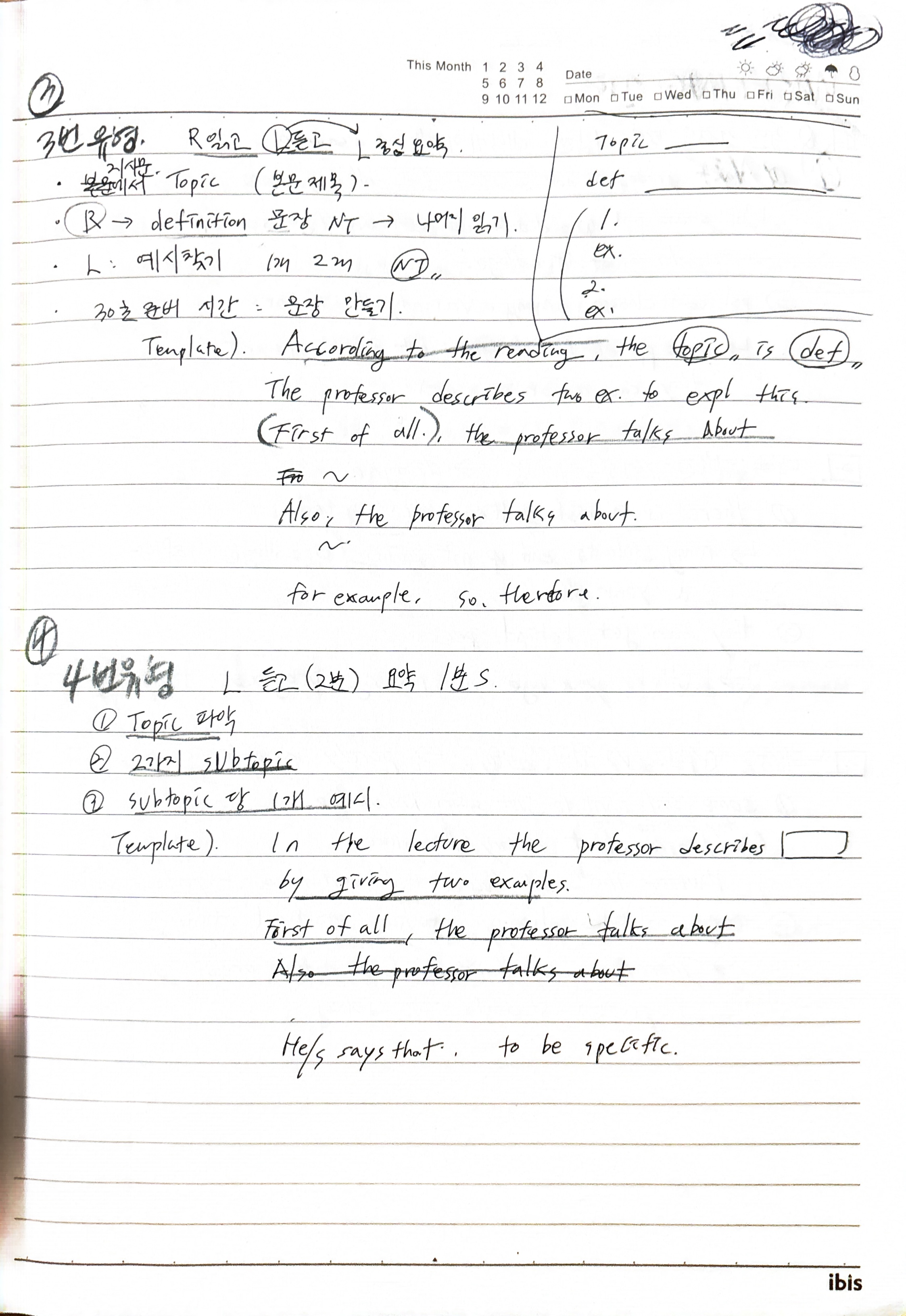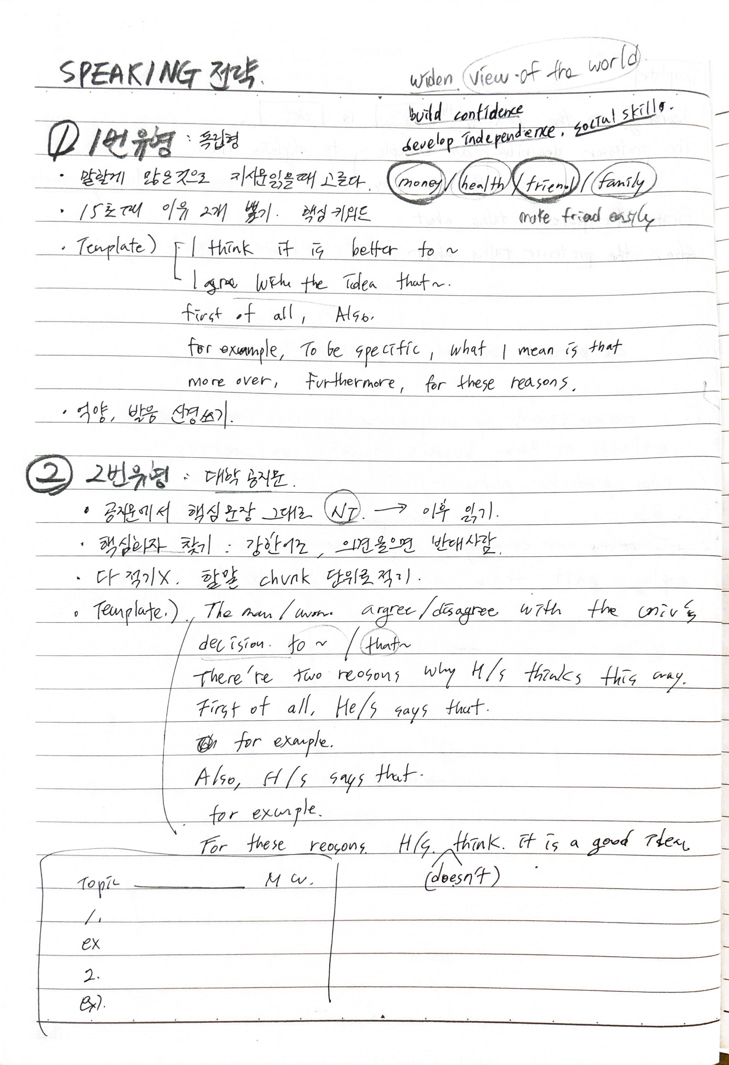해커스 스피킹 맨 뒷쪽을 보면 유형1번의 예상 질문과 그에 대한 모범 답안이 나와있다. 난 이걸 노트에 베껴적으면서 내가 생각하기에 더 나은 아이디어가 있다면 조금씩 바꿔서 나만의 모범 답안을 만들었다. 약 20개 정도의 질문에 대한 답을 준비했는데, 실전에서 연관된 질문이 나왔다. 예를 들어 나는 "나이 많은 선생과 젊은 선생 중 누구에게 배울 것인가?" 에 대한 답변을 준비했고, 이때 "students can get advices from old teachers who have many experiences"라는 답변을 준비했다. 실전에서는 "부모는 아이의 친구가 될 수 있는가?" 라는 질문이 나왔고, 나는 위의 답변에서 teacher를 parents로만 바꿔서 답변했다. (그게 아주 적절한 답이었는지는 잘 모르겠으나, 적어도 막힘 없이 유창하게 말했다는 점에서 난 이미 만족한다. ㅎㅎ...) 제 노트를 스캔해서 pdf로 올려놓을테니 필요한 분들은 다운받아 쓰세요.